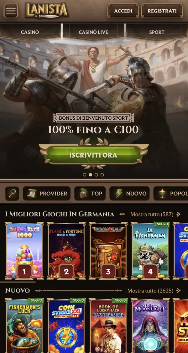 - Menu giochi esteso: Slot, roulette, blackjack, video poker, baccarat, bingo, keno, gratta e vinci, crash game e altro, incluse sezioni slot Lanista con filtri per provider e funzionalità.